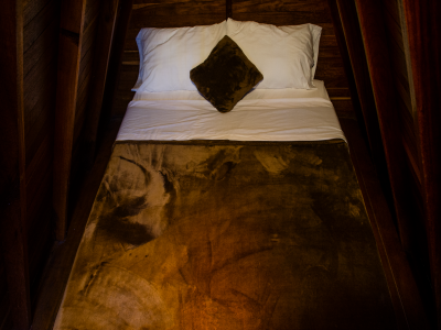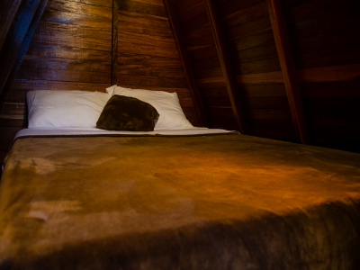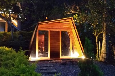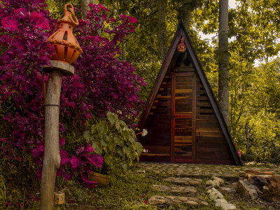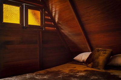 Descubre un mundo de sensaciones en esta cabaña única con pared de espejos y forma peculiar. Cuenta con amplio espacio al aire libre, ideal para hasta tres personas (Cama doble y cama auxiliar), con baño interior.